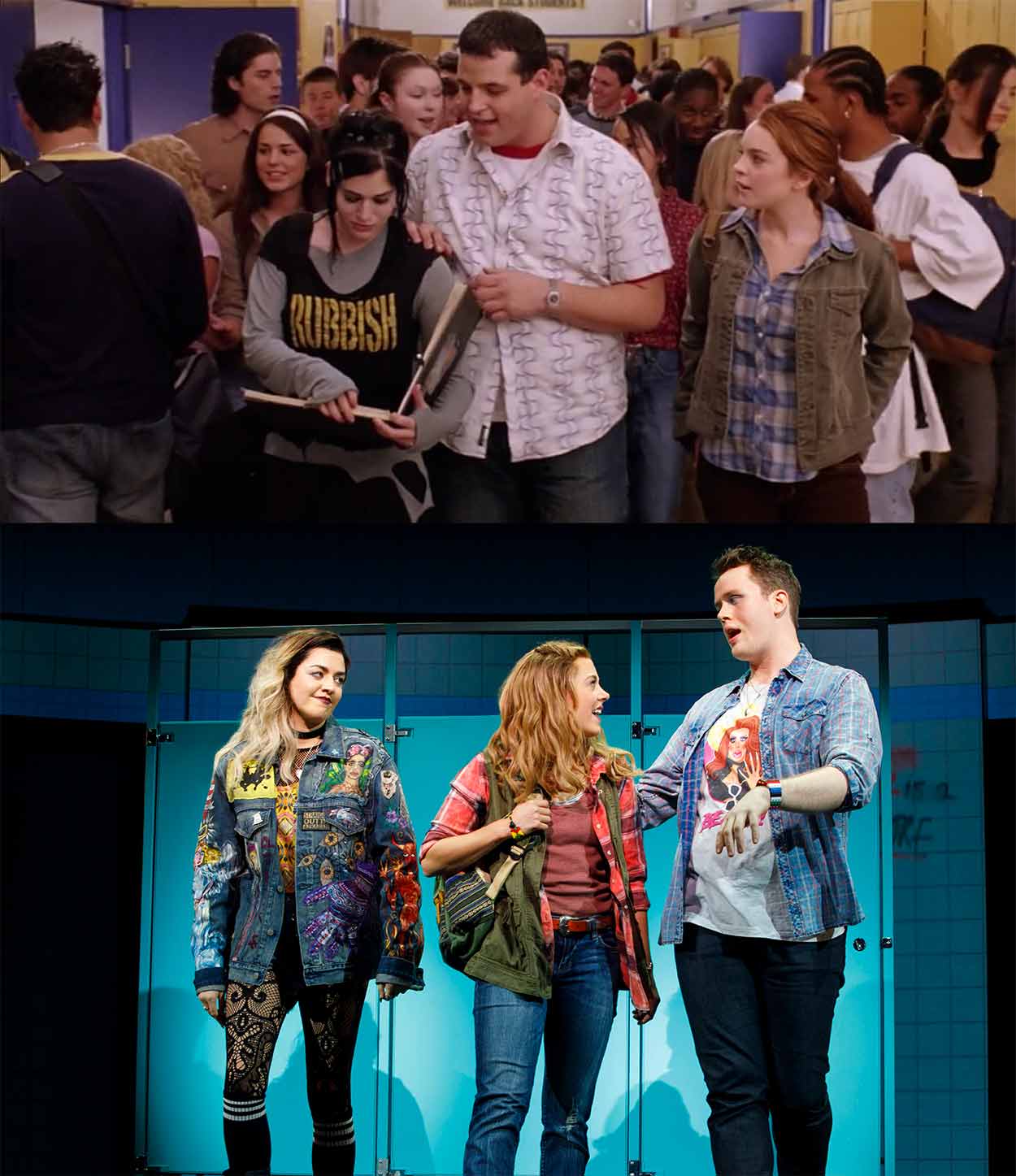 Above: Janis, Damian, and Cady (played by Lizzy Caplan, Daniel Franzese, and Lindsay Lohan) in the movie version of ‘Mean Girls.’ Below: The same three characters in the stage version of the show (played by, from left to right, Barrett Wilbert Weed, Erika Henningsen, and Grey Henson). [Top: Paramount Pictures. Bottom: Joan Marcus]