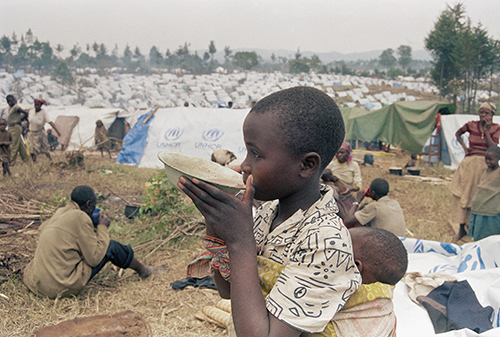 A young Rwandan refugee sips some soup at a newly functional refugee camp some 25 miles west of Bukavu, Zaire, Wednesday, August 24, 1994. (AP Photo/Javier Bauluz)