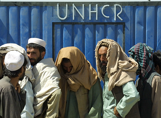 Afghan men stand in line to get humanitarian aid from the United Nations High Commissioner for Refugees (UNHCR) food distribution center in Kabul, Afghanistan, Tuesday, July 9, 2002. (AP Photo/Sergei Grits)