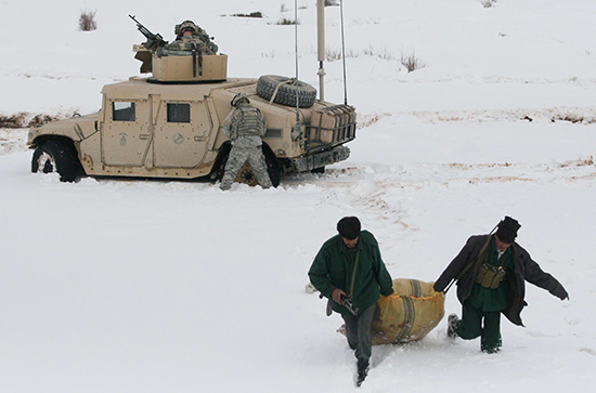 Afghan police officers drag a sack full of blankets. Soldiers were meeting with village representatives to assess their needs, provide humanitarian aid assistance and to gain intelligence about the region.(AP Photo/Rafiq Maqbool)