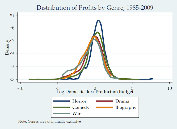 Substandard buddy Gabriel Rossman (a data-driven sociology professor at UCLA and author of an excellent book on radio airplay, Climbing the Charts) went and checked the math for us and it turns out that horror movies, as a class, are far and away the most profitable genre. Have a look: