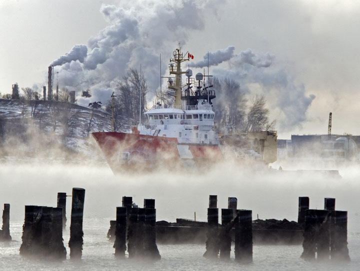 The Canadian Coast Guard icebreaker Earl Grey heads to dock in Dartmouth, Nova Scotia through Arctic sea smoke on Halifax Harbour. (AP Photo)