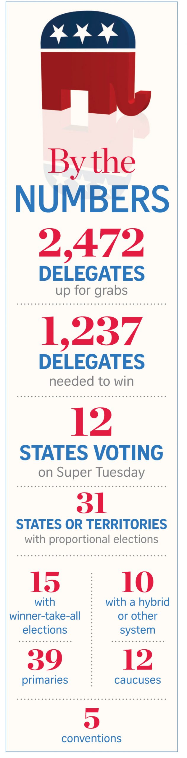 There will be 2,472 delegates to the convention, including 168 Republican National Committee members from the 50 states, the District of Columbia and five territories (American Samoa, Guam, the Northern Marianas, Puerto Rico, the Virgin Islands), so a candidate needs 1,237 delegates to win the nomination. What follows is an analysis of the contests in chronological order, from Feb. 1 to June 7, indicating each state’s number of delegates, whether they are elected winner-take-all or proportionally, and showing the initial threshold percentage needed to win delegates.