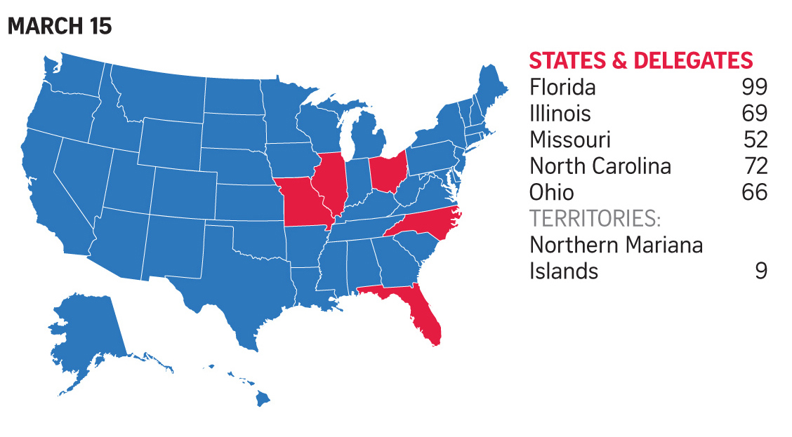 March 15 is the first date for winner-take-all contests, and all the 156 delegates in Florida and Ohio, the nation’s third and seventh most populous states, will be awarded to the candidate who wins the most votes statewide. In addition, it’s possible that all or nearly all of the 69 delegates from Illinois, the nation’s fifth most populous state, will go to one candidate. So it’s possible for a candidate who wins all three states to jump to a wide lead in delegates.