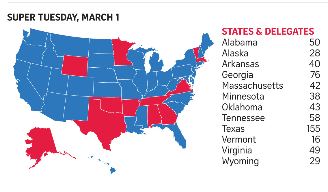This is Super Tuesday, the set of mostly Southern primaries first put together in 1988 by Democrats who hoped for the nomination of a centrist Southern candidate. Those hopes were fulfilled, but in the Republican party, by the nomination of Texas’ George H.W. Bush. The list of states voting on Super Tuesday has changed somewhat every four years, but in this cycle more Republican delegates will be chosen on this date — 624, slightly more than half those needed for the nomination — than on any other day. States voting include the state with the second and fifth largest delegations, Texas and Georgia respectively.