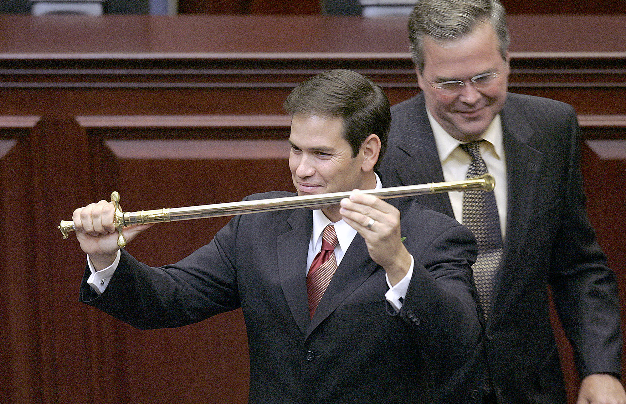 Both Marco Rubio and Jeb Bush have won elections in Florida before, though they trail in the polls now. In 2005, Rubio, then a Florida representative, is designated as speaker of the House in a ceremony with then-Gov. Bush. (AP Photo)