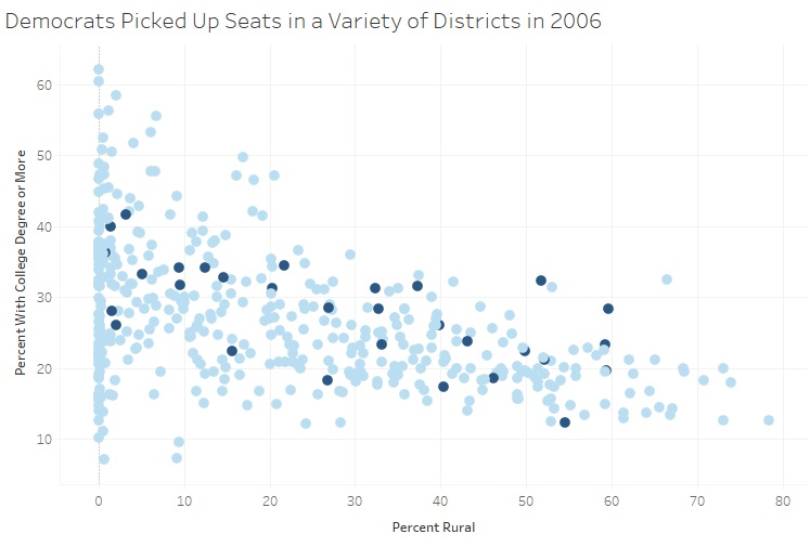 There’s no clear pattern in this graphic—meaning Democratic gains weren’t confined to one type of district. Some Democrats won in more rural areas, and others won in more urbanized districts. Some Democrats won in areas with a lot of college graduates, some won in areas without many. A similar non-pattern shows up when you map the 2006 House elections.