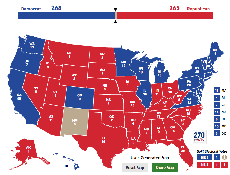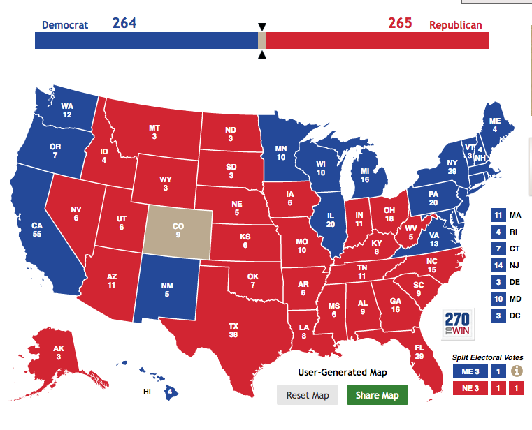 Basically, you can switch around a few different variations of swing states and get both candidates under 270, but it needs to be close to this scenario.