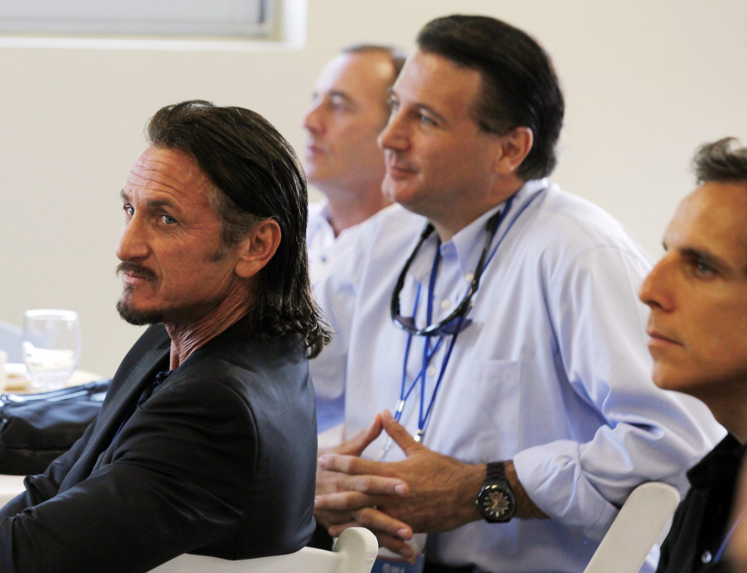 Sean Penn (left), Ben Stiller (far right) and other celebrities attend the Caracol Industrial Park grand opening ceremony. (AP Photos)
