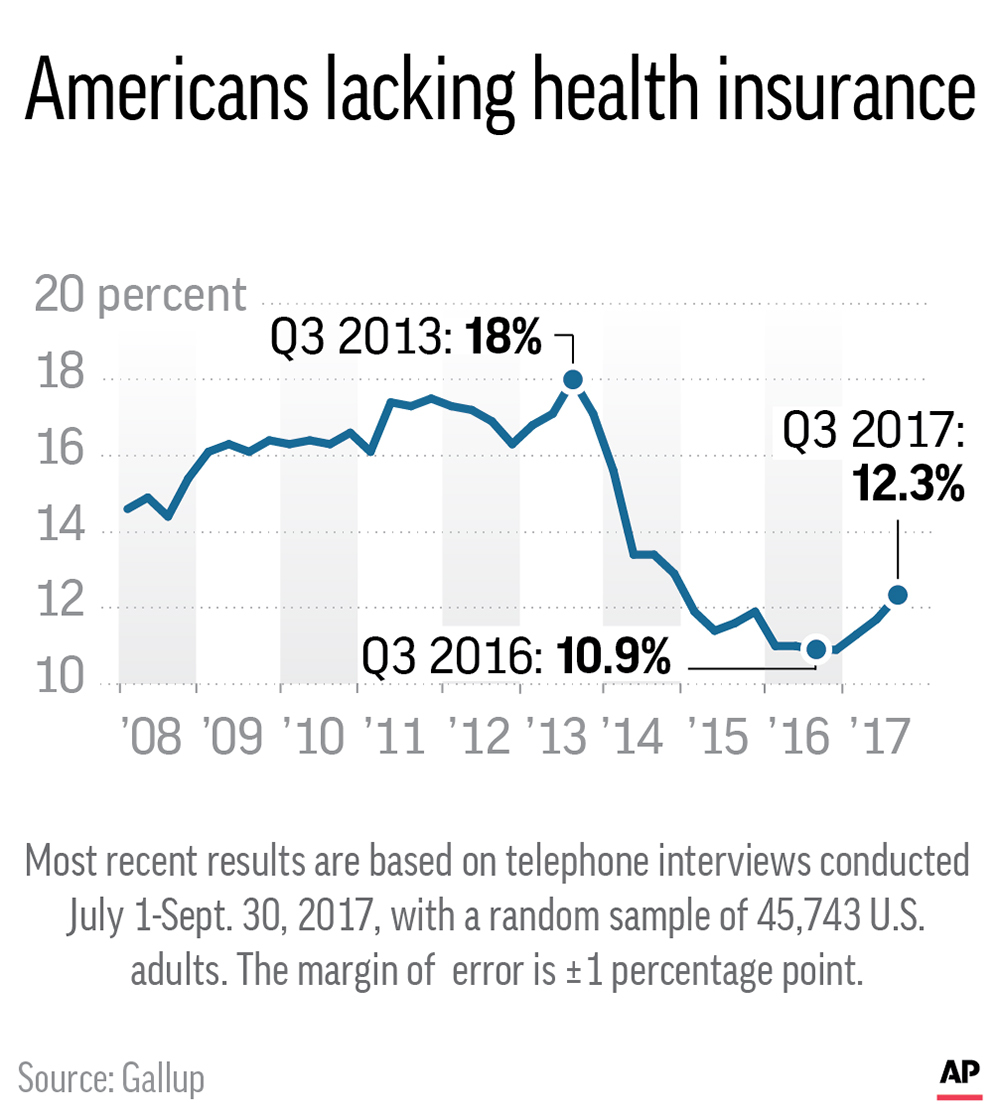 The new uninsured rate, measured by Gallup and Sharecare, released Friday shows an increase in the third quarter of 2017 to 12.3 percent, a 1.4 percentage point increase from the end of 2016.
