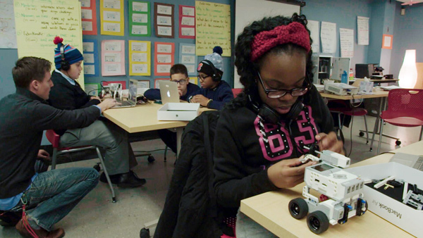 In a scene depicted in ‘Ex Libris,’ Children build and program Lego robots in an after-school program in the NYPL’s Westchester Square branch. (Zipporah Films)
