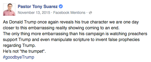Last November, Suarez took to Facebook to slam both Trump and the religious leaders supporting him.