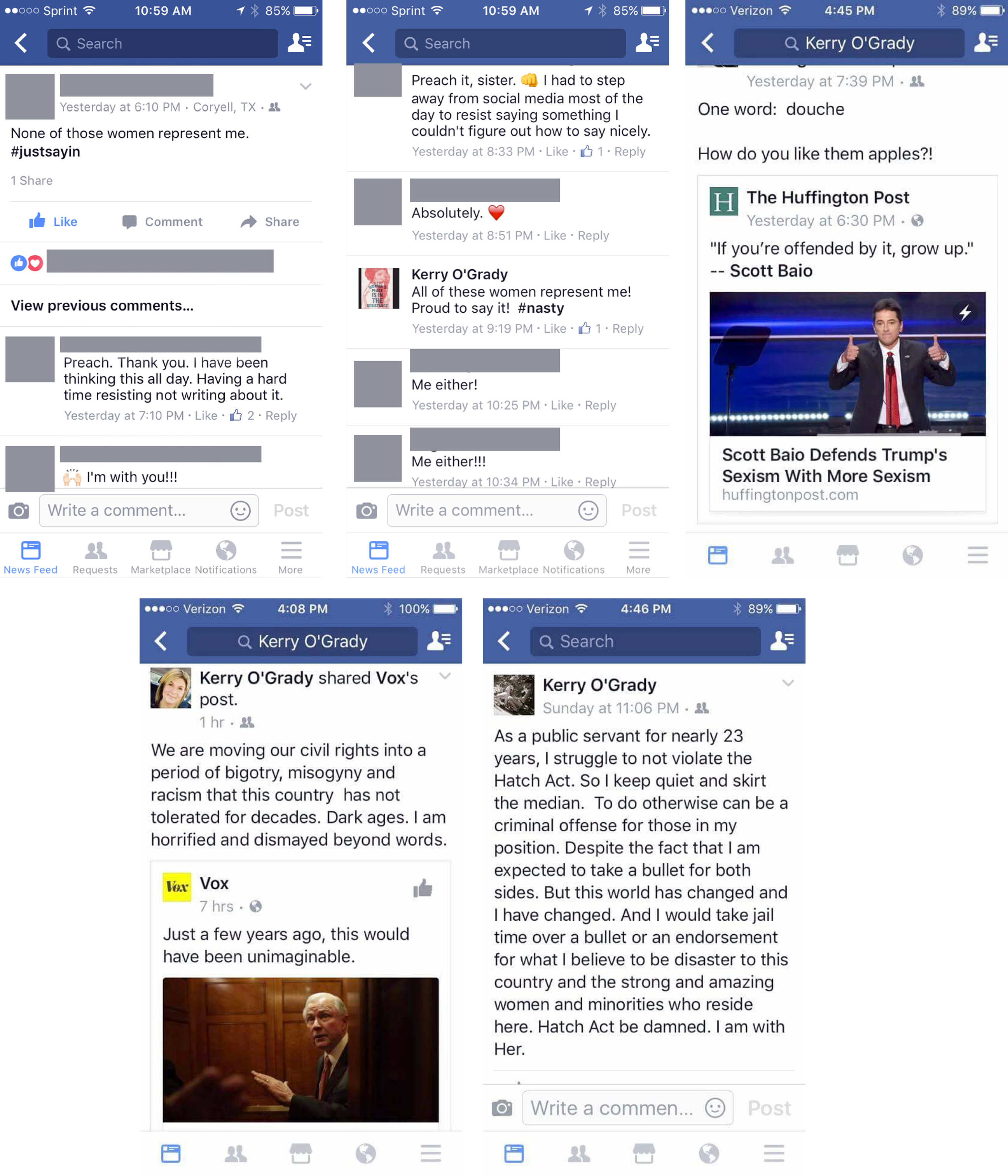 In another pre-election post that no longer appears on her Facebook page, O’Grady shared a Huffington Post story with the headline: “Scott Baio Defends Trump’s Sexism with More Sexism.” She accompanied her Facebook post of the story with the words: “One word: douche. How do you like them apples?!”