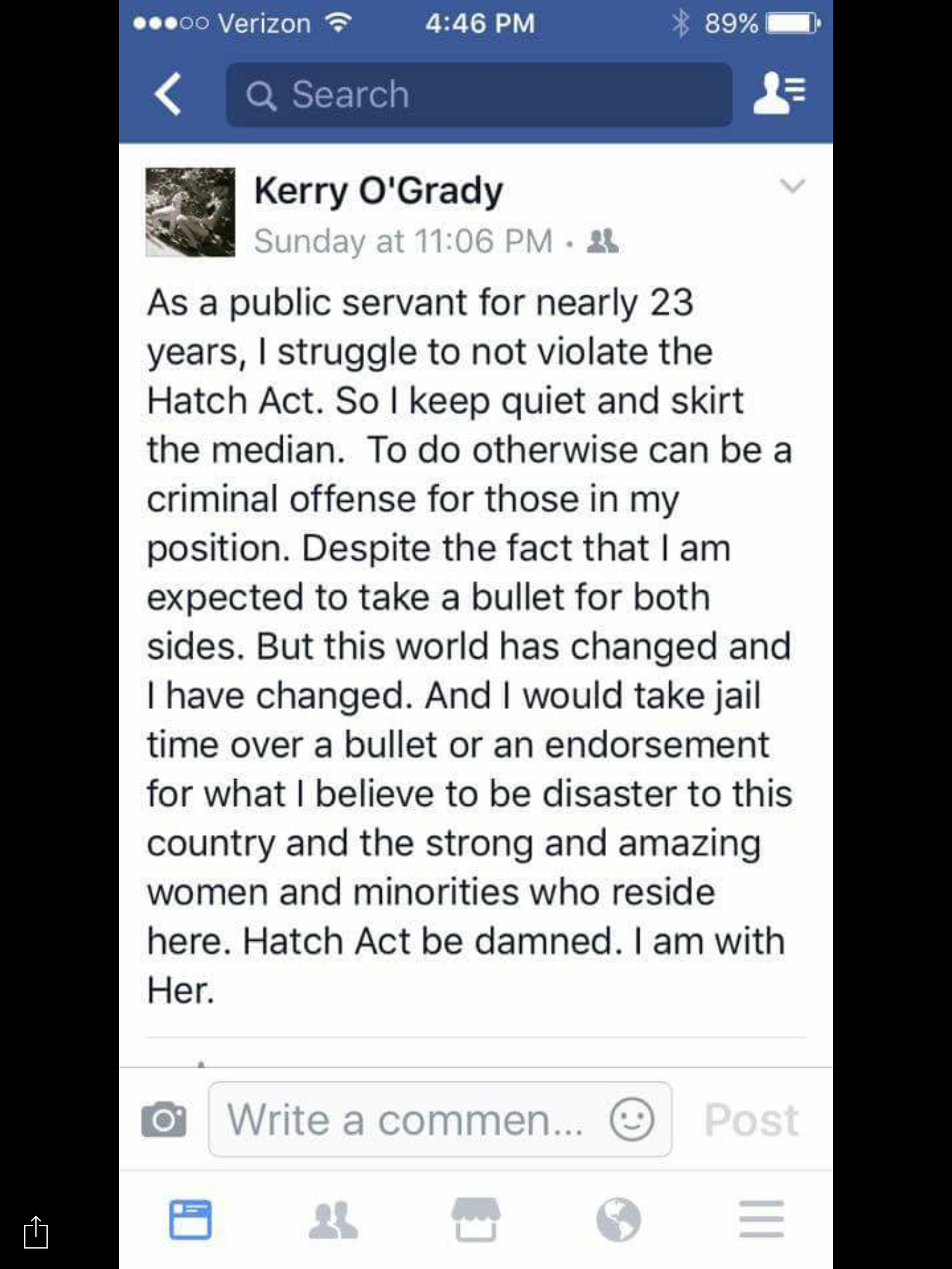 “But this world has changed and I have changed. And I would take jail time over a bullet or an endorsement for what I believe to be disaster to this country and the strong and amazing women and minorities who reside here. Hatch Act be damned. I am with Her.”