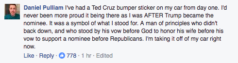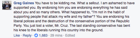 Dozens more Cruz supporters took to his Facebook page to leave brutal comments about his change of heart.