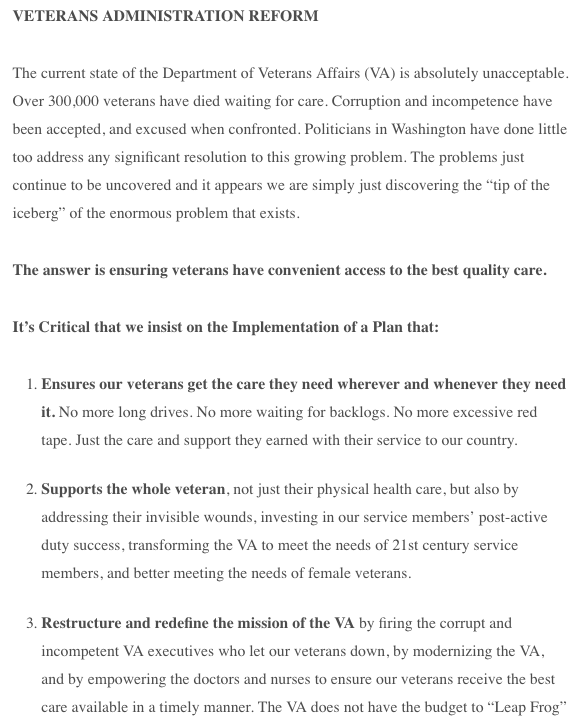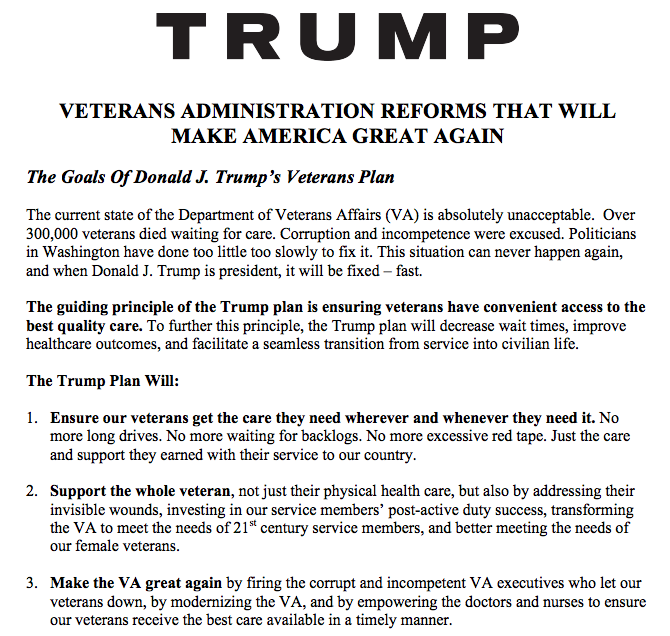 Trump’s three-page plan is laid out on his campaign website in a document entitled “Veterans Administration Reforms That Will Make America Great Again” that Trump himself previewed at a rally in Norfolk, Virginia. Based on news reports from the rally, the plan was not only new to the public, but perhaps to Trump himself as well. Trump often speaks off the cuff at rallies, but in this case, local station WAVY reported, “Trump was reading from prepared notes. He was not ad-libbing, but was giving a thoughtful plan to fix what he thinks is wrong with the VA system…”