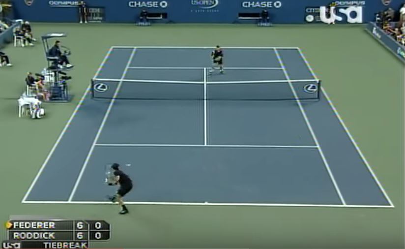 Fourth. Roddick takes the tougher but surer route: an inside-out forehand to Federer’s backhand. And he bashes it.