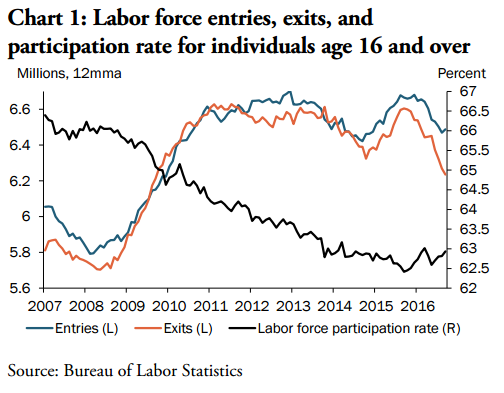 “While a growing labor force would seem to suggest a surge of new and previously discouraged workers entering the labor force, entries into the labor force actually declined in the past year,” they wrote.
