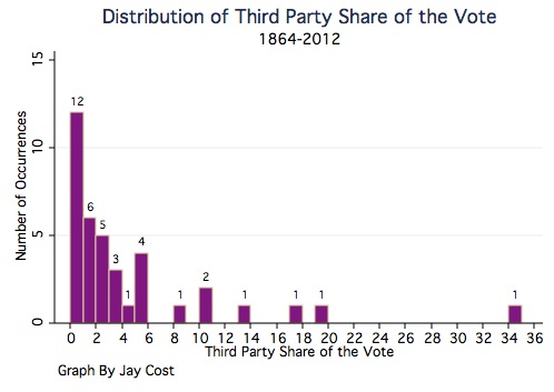 The rule is not ironclad, of course, but history demonstrates that third parties have had a rough go of it in our system. The following is a frequency graph that tracks how well third parties have done since 1864 (when the current Democratic-Republican divide stabilized). Each bar counts how many times third parties have gotten the corresponding share of the vote.