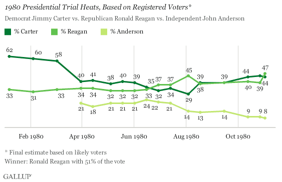At one point in the early summer of 1980, Anderson was in a statistical tie with Jimmy Carter and Ronald Reagan, according to the Gallup poll. As voters began to plug into the campaign, his numbers fell. A similar phenomenon happened to Ralph Nader in 2000. In many polls during that cycle, Nader was polling in the high single digits. His numbers sank as election day approached, and he underperformed almost all of the final polling estimates.