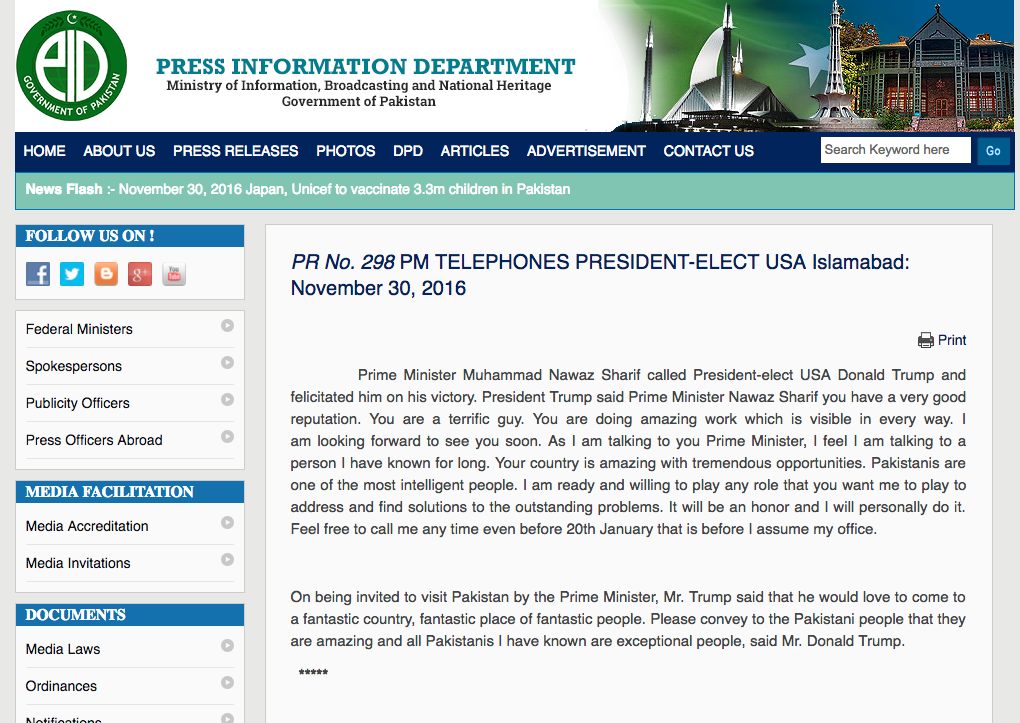 President-elect Trump spoke by phone with Pakistani Prime Minister Muhammad Nawaz Sharif on Wednesday, after which the public relations arm of Pakistan’s government issued a statement about the two men’s conversation that quickly went viral.