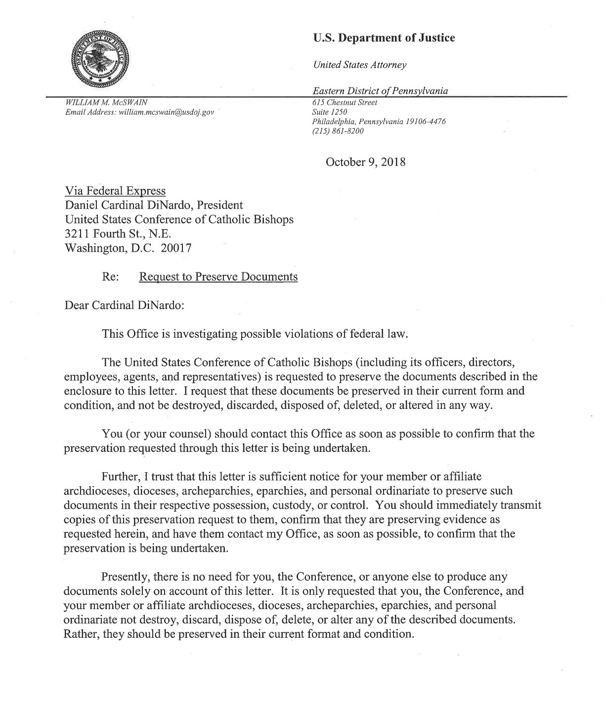 The U.S. Attorney for the Eastern District of Pennsylvania has asked the United States Conference of Catholic Bishops to preserve all electronic and paper documents in case other federal prosecutors need to look into accusations of sexual assault against current and former church leaders, according to a report published Friday.
