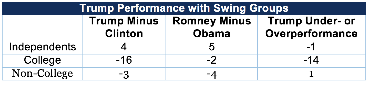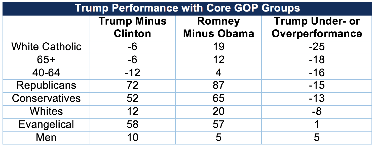 To start, let’s look at how Trump is doing with core Republican groups relative to Mitt Romney’s performance in 2012.