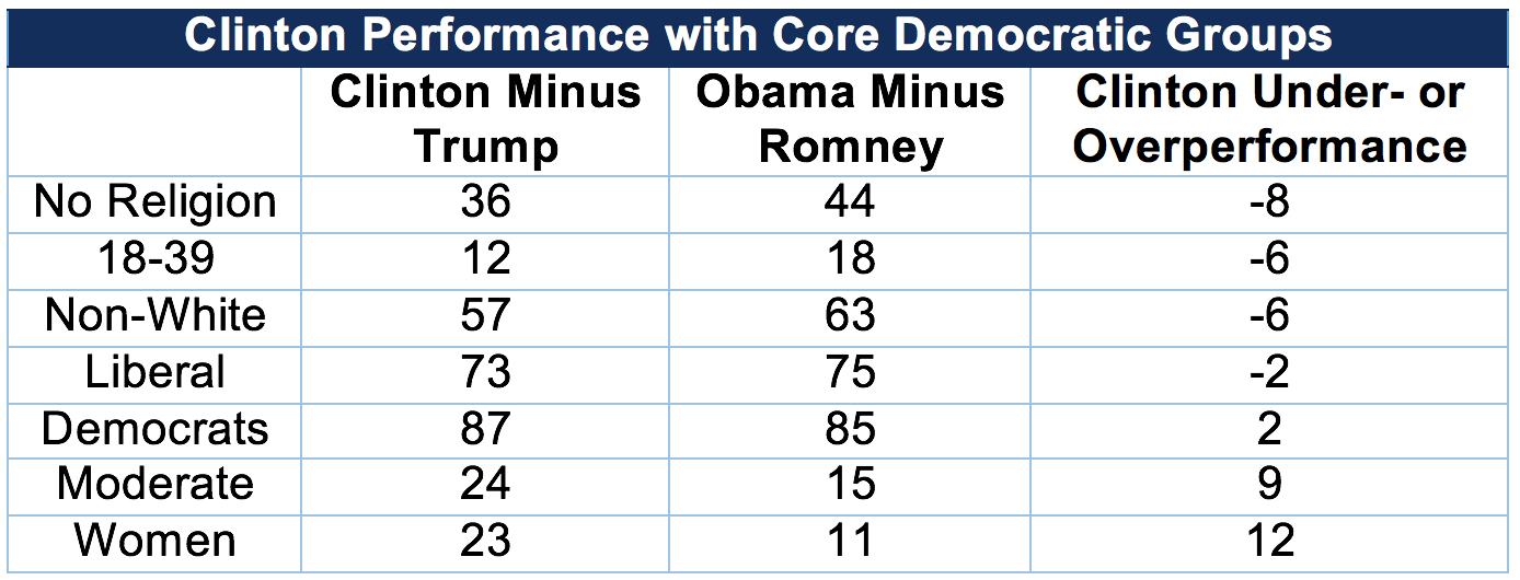 Meanwhile, how is Clinton doing with the core Democratic voters, relative to Barack Obama’s performance in 2012?