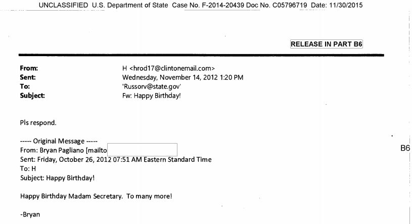 In the email, Pagliano wishes Clinton a “Happy Birthday” and “many more!” Rather than responding to Pagliano, however, Clinton forwarded the email to then-Special Assistant to the Secretary of State, Robert Russo, with a curt “Pls. respond.”