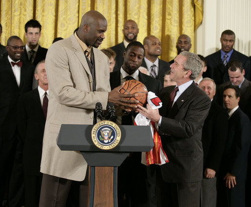 By the standards of normal human measurements, Kevin Durant is tall-plus. He’s 6 feet, 9 inches, but his wingspan (88 and 3/4 inches) is just about as broad as Shaquille O’Neal’s (91 inches). If you need a refresher on the immensity of Shaq, here he is standing next to President George W. Bush.