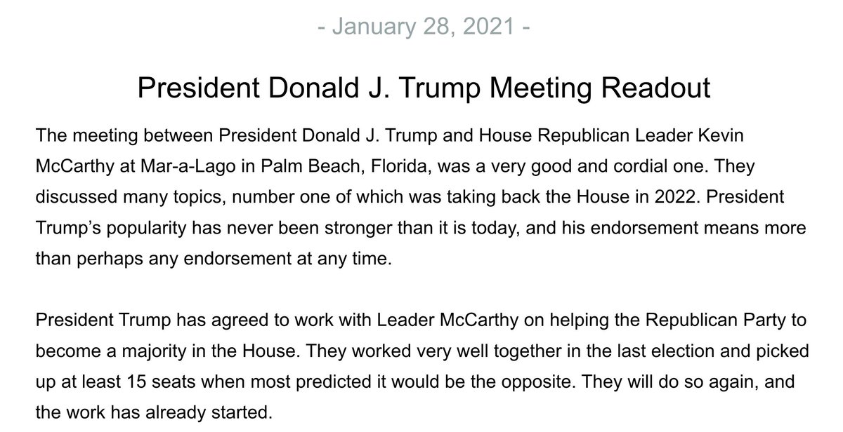 McCarthy also released a statement about the meeting with Trump, echoing calls for Republicans to commit to winning the House in 2022. “A united conservative movement will strengthen the bonds of our citizens and uphold the freedoms our country was founded on,” the California Republican said.