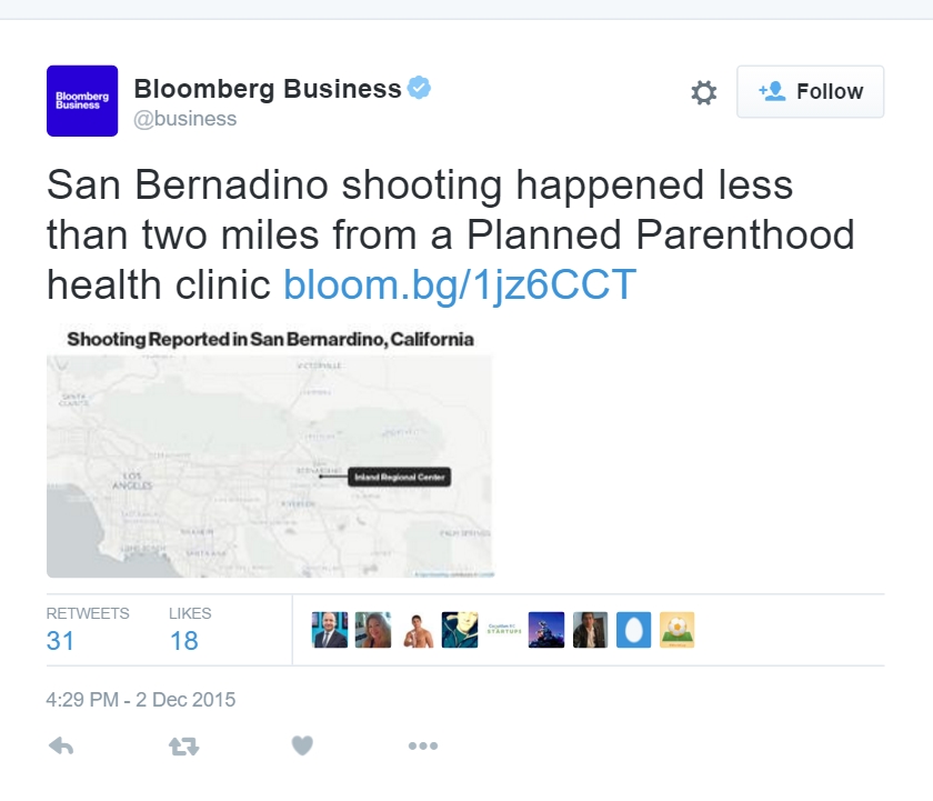 Bloomberg Business tweeted from its official account, “San Bernardino shooting happened less than two miles from a Planned Parenthood health clinic.”
