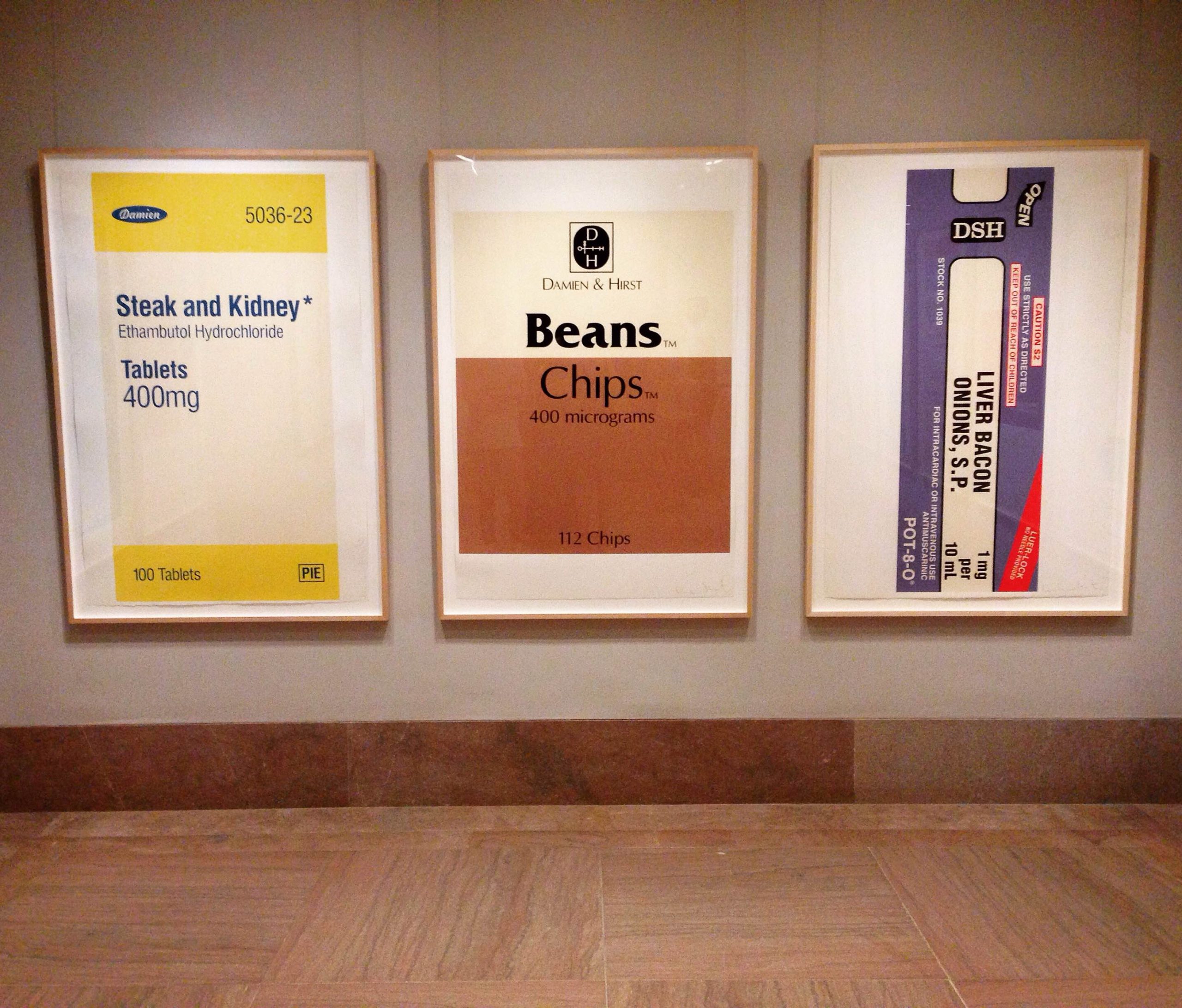 “BEANS CHIPS,” a large half-brown, half-white print screamed at me. I had arrived. The walls were stuffed with floor-to-ceiling, color-blocked posters. They were modeled after drug labels, but the artist, Damien Hirst, had replaced the names of pharmaceuticals with common food items found in his native Britain. To be sure, he included his name on every print, and signed the bottom right-hand corner with the scrabbly signature of a genius.