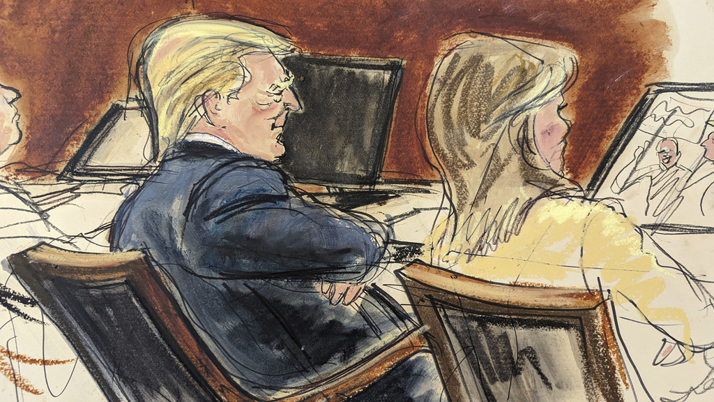 In this courtroom sketch, Donald Trump sits with arms folded beside his attorney, Alina Habba, in federal court in New York, Wednesday, Jan. 17, 2024. (Elizabeth Williams via AP)