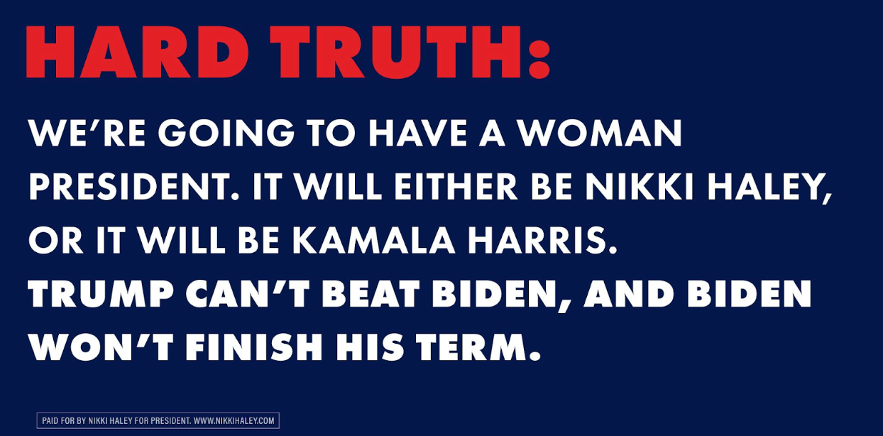 Haley contends former President Donald Trump cannot win against Biden and that the 81-year-old president is unlikely to finish another full term, which could result in Harris becoming president.