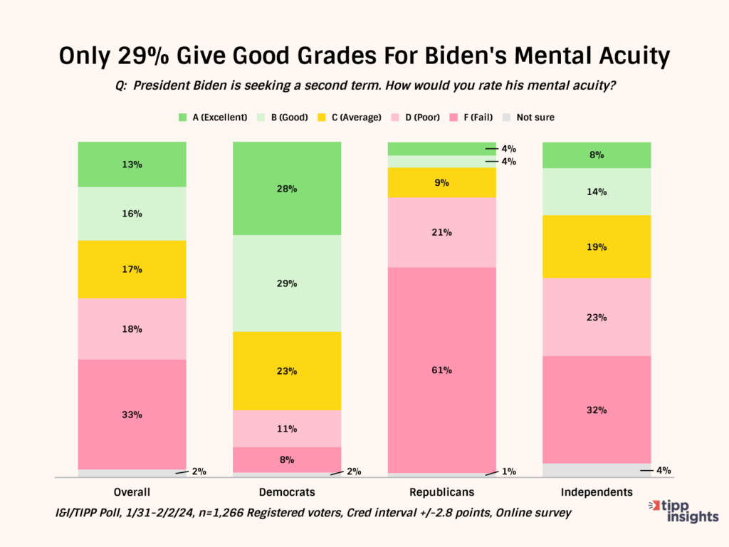 In the latest I&I/TIPP poll, when voters were asked to grade the 81-year-old’s “mental acuity,” 33% said “fail,” and another 18% said “poor.”