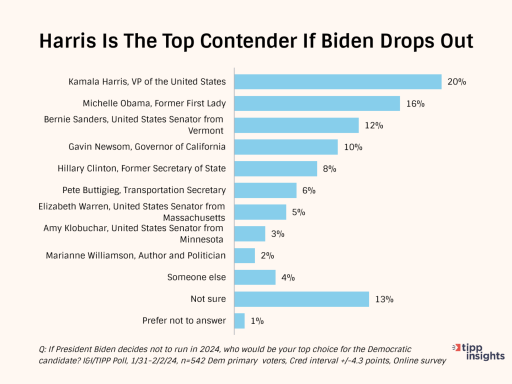 While, to many Democrats, the obvious pick is Vice President Kamala Harris, just 20% named her as the top contender. Some 18% chose “someone else,” “not sure,” and “prefer not to answer.”
