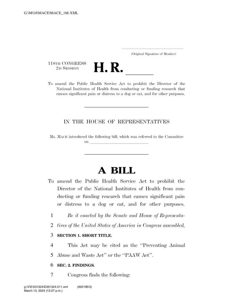 “We applaud Reps. Mace and Moskowitz for introducing the bipartisan PAAW Act and their outstanding leadership to cut the NIH’s taxpayer-funded cruelty to canines and kittens. When it comes to painful and unnecessary dog and cat testing, wasteful NIH spending is the problem, and the PAAW Act is the solution. Stop the money. Stop the madness!” he added.