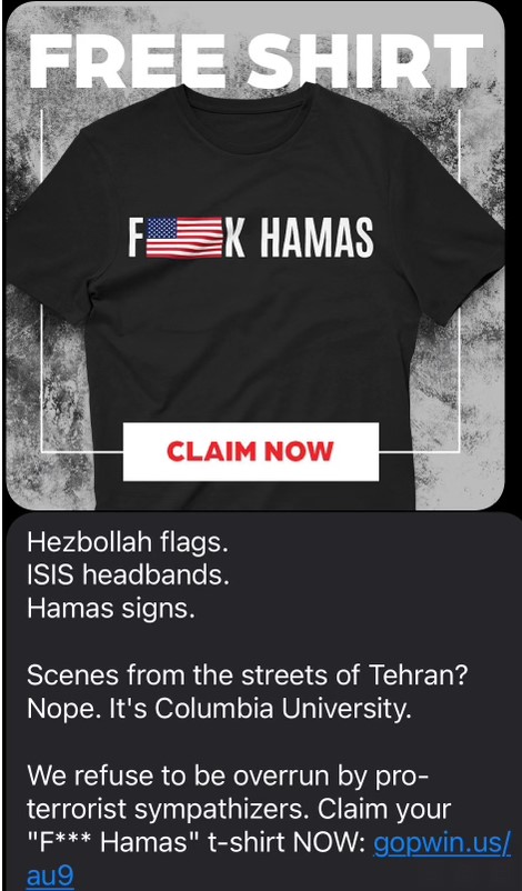 The letter promoting the “free shirt” continued, “We refuse to be overrun by pro-terrorist sympathizers. Claim your ‘F*** Hamas’ T-shirt NOW.”