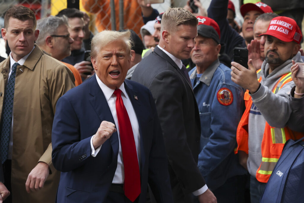 Former President Donald Trump reacts while meeting with construction workers at the construction site of the new JPMorgan Chase headquarters in midtown Manhattan on Thursday, April 25, 2024, in New York. (AP Photo/Yuki Iwamura)
