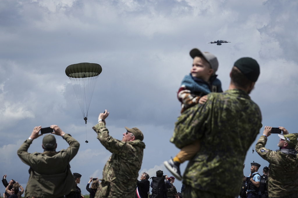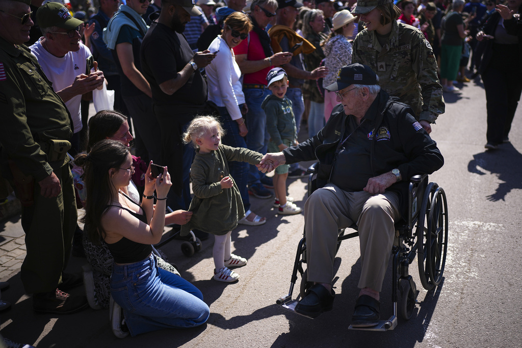 French President Emmanuel Macron, center left, his wife Brigitte Macron, left, President Joe Biden, center right, and first lady Jill Biden, right, attend a ceremony together with World War II veterans at a U.S. cemetery near Colleville-sur-Mer Normandy, France, Thursday, June 6, 2024. World War II veterans from across the U.S., as well as Britain and Canada, are in Normandy this week to mark 80 years since the D-Day landings that helped lead to Hitler’s defeat. (AP Photo/Laurent Cipriani)U.S. World War II veteran Warren Morrison is greeted by a little girl during an American Airlines veterans parade in Sainte-Mere-Eglise, Normandy, France, Wednesday, June 5, 2024. World War II veterans from across the U.S., as well as Britain and Canada, are in Normandy this week to mark 80 years since the D-Day landings that helped lead to Hitler’s defeat. (AP Photo/Daniel Cole)