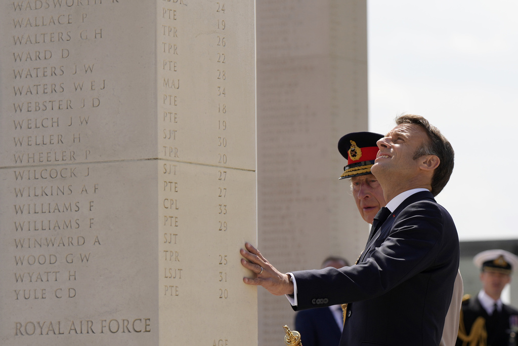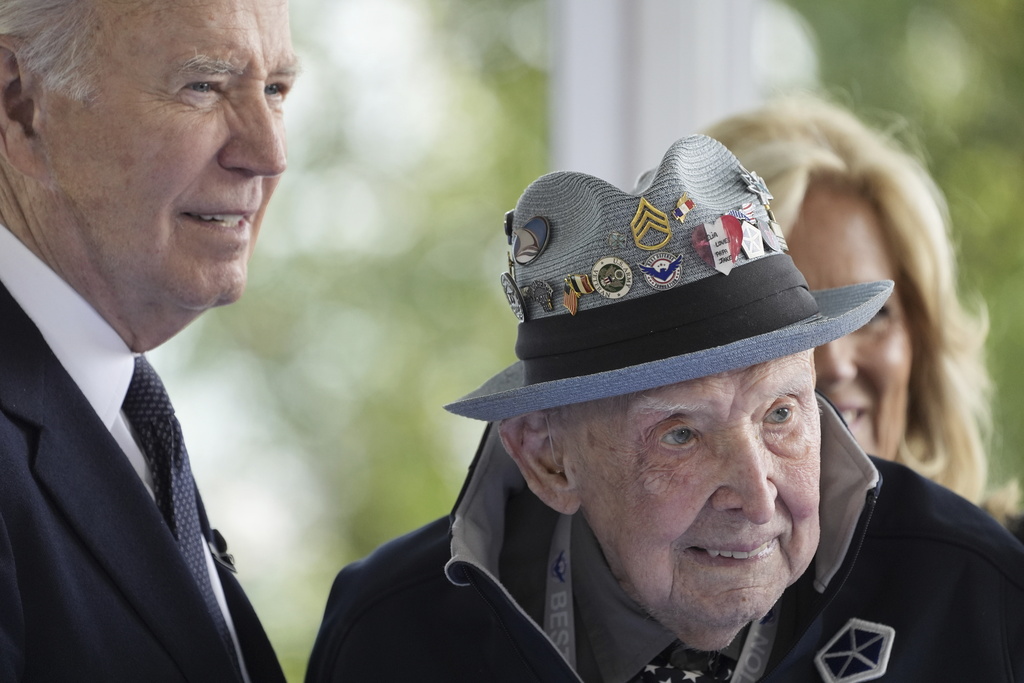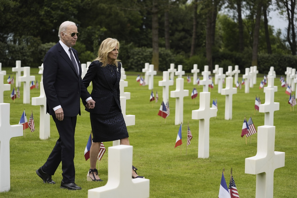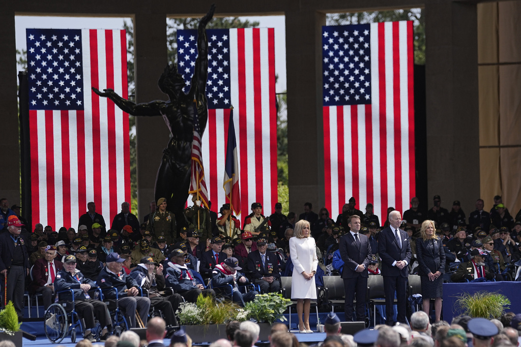 President Joe Biden delivers a speech during a commemorative ceremony to mark the 80th anniversary of D-Day, Thursday, June 6, 2024, at the Normandy American Cemetery in Colleville-sur-Mer, Normandy, France. Normandy is hosting various events to commemorate the 80th anniversary of the D-Day landings that took place on June 6, 1944. (AP Photo/Daniel Cole)Attendees listen to President Joe Biden’s speech during a ceremony to mark the 80th anniversary of D-Day at Normandy American Cemetery in Colleville-sur-Mer, Normandy, France, Thursday, June 6, 2024. World leaders gathered Thursday in France to mark the 80th anniversary of the D-Day landings. (AP Photo/Virginia Mayo)French President Emmanuel Macron and Britain’s King Charles III look at engravings as they attend the U.K.’s national commemorative event for the 80th anniversary of D-Day in Ver-sur-Mer, France, Thursday, June 6, 2024. (AP Photo/Alastair Grant)From left, Britain’s King Charles III, President of France Emmanuel Macron, Queen Camilla, and Brigitte Macron walk by the memorial wall during the U.K. national commemorative event for the 80th anniversary of D-Day, held at the British Normandy Memorial in Ver-sur-Mer, Normandy, France, Thursday, June 6, 2024. (Eddie Mulholland /Pool Photo via AP)President Joe Biden and first lady Jill Biden greet a World War II veteran during ceremonies to mark the 80th anniversary of D-Day, Thursday, June 6, 2024, in Normandy, France. (AP Photo/Evan Vucci)Christophe Receveur, of France, unfurls an American flag he bought six months ago in Gettysburg, Pennsylvania, to mark D-Day, Thursday, June 6, 2024, on Utah Beach, Normandy, France. As the sun sets on the D-Day generation, it’s rising again over Normandy beaches where soldiers fought and died exactly 80 years ago, kicking off intense anniversary commemorations, Thursday, against the backdrop of renewed war in Europe, in Ukraine. (AP Photo/John Leicester)President Joe Biden and first lady Jill Biden greet a World War II veteran during ceremonies to mark the 80th anniversary of D-Day, Thursday, June 6, 2024, in Normandy, France. (AP Photo/Evan Vucci)People attend a multinational parachute drop as some 400 British, Belgian, Canadian, and U.S. paratroopers jump to commemorate the contribution of airborne forces on D-Day as part of the 80th anniversary of D-Day, in Sannerville, Normandy, France, Wednesday, June 5, 2024. Veterans and world dignitaries gather in Normandy to commemorate the 80th anniversary of the landings. (AP Photo/Laurent Cipriani)President Joe Biden and first lady Jill Biden walk in the Normandy American Cemetery following a ceremony to mark the 80th anniversary of D-Day, Thursday, June 6, 2024, in Normandy, France. (AP Photo/Evan Vucci)