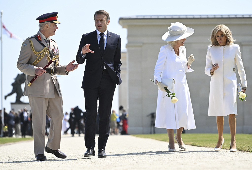 President Joe Biden, first lady Jill Biden, French President Emmanuel Macron, and Macron’s wife, Brigitte Macron, walk onstage during ceremonies to mark the 80th anniversary of D-Day, Thursday, June 6, 2024, in Normandy, France. (AP Photo/Evan Vucci)