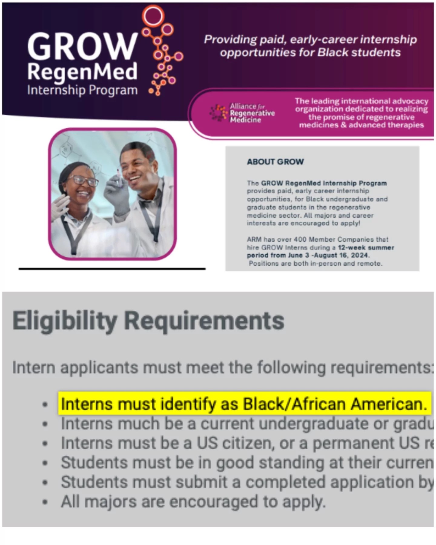 Do No Harm, a national organization advocating against discriminatory practices in healthcare, claims ARM’s GROW RegenMed Internship Program unlawfully restricts eligibility to black students.