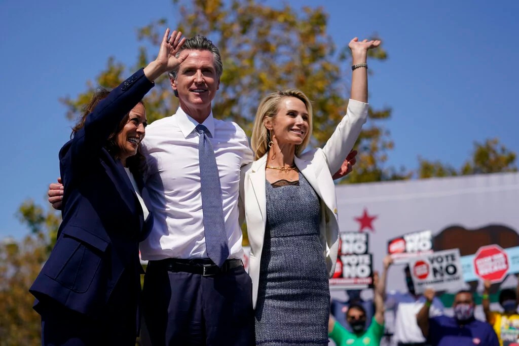 Kamala Harris stands onstage with Gov. Gavin Newsom (D-CA) and his wife at a campaign event in 2021. (AP Photo/Carolyn Kaster)