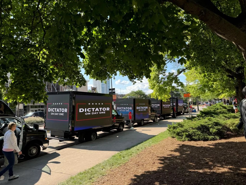 A fleet of trucks reading “Dictator on Day One” appeared outside a protest over the police-involved shooting of Samuel Sharpe Jr. in Milwaukee. The Biden campaign frequently invokes Trump’s comment that he would not be a dictator, except for his first day in office.