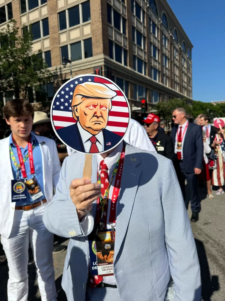 Conventiongoers show up to the Fiserv Forum decked out in Trump gear. Among the swag was a pair of “Trump 2024” shoes and paper fans featuring a laser-eyed Trump.