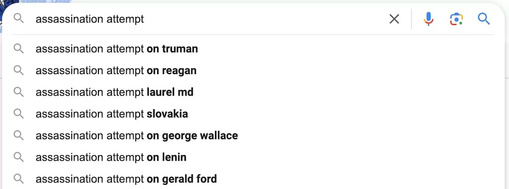 When someone goes to Google to search “assassination attempt,” despite Trump being the most recent victim of such violence, his name isn’t suggested as one of the search results. Other assassination attempts of presidents and politicians, such as President Harry S. Truman’s in 1950, are common search suggestions. Some Republicans believe Google is censoring the event.