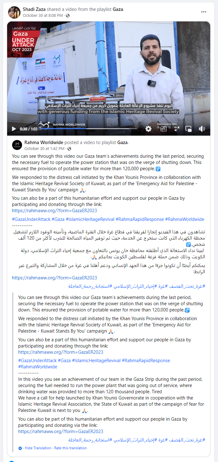 The Islamic Association of North America, the recipient of the state grants from 2019 to 2024, is fundraising after Hamas’s Oct. 7 attack on Israel last year for Rahma Worldwide, a Michigan-based charity that says it is shipping humanitarian aid to Gaza, according to flyers. In a since-deleted Facebook post in October 2023, Rahma Worldwide President Shadi Zaza revealed his charity was collaborating on an aid initiative with the Islamic Heritage Revival Society of Kuwait, a terrorist group sanctioned by the U.S. government for funding al Qaeda.