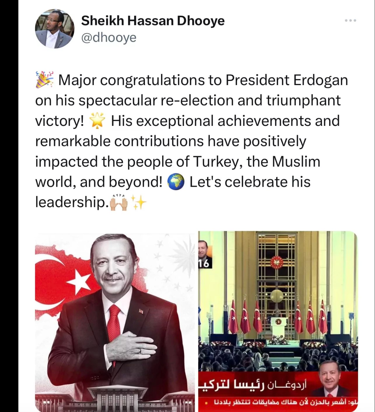 Dhooye recently congratulated Turkish President Recep Tayyip Erdogan, a Hamas ally, for his reelection. In 2020, Dhooye was part of a delegation of Muslim leaders who met with Erdogan in Ankara, Turkey, according to a press release.
